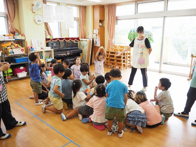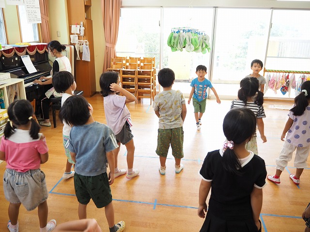 今日は保育実習生が5歳児ひまわり組のクラス活動をリードする実習をしました。もちろん担任もそばにいて見守っています。