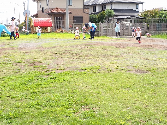園舎隣り広場の1歳児うめ組。例えば、まっ平なところで走ることと、草や土や小石や凸凹の場所で走ることは、体の使い方や足裏感覚平衡感覚や足元への注意力が異なってくると思います。時々転んでしまうことがありますが、1歳児のこの子たちにとって、この瞬間も育ちの場面だと思います。