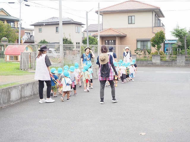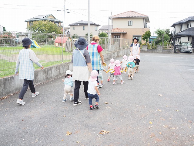 2歳児ゆり組。誘導ロープでお散歩に出発。