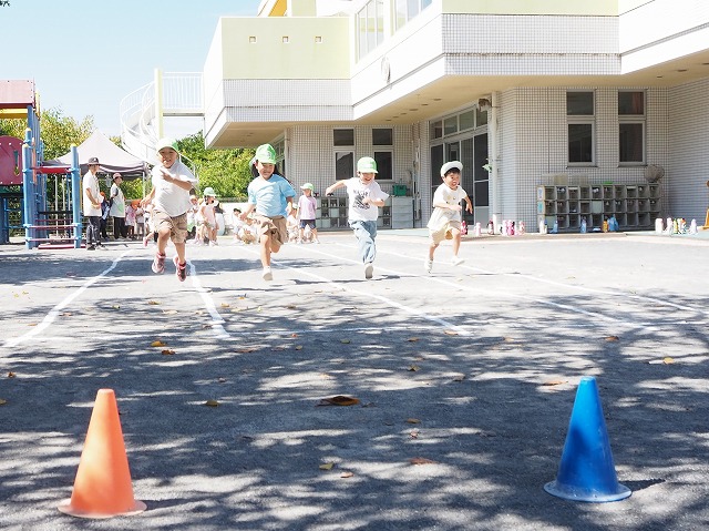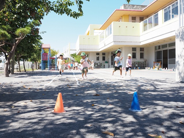 走るレーンがはっきりとわかると、こどもたちは上手に走っていました。東京陸上みたい、と言っていた子がいました。先日まで連日テレビで東京世界陸上が放送されていました。選手のように、よりかっこいいかけっこが見られそうです。