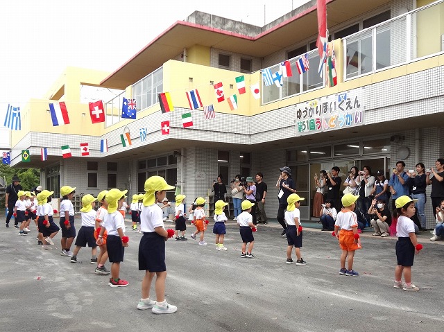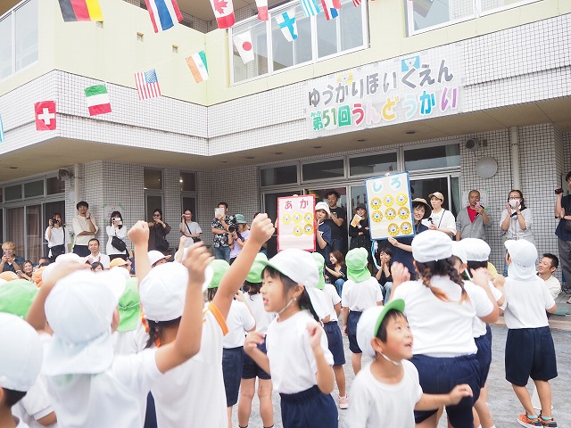 ポツポツと雨が降ったりやんだりする中で、第51回ゆうかり保育園運動会は園庭で行うことができました。