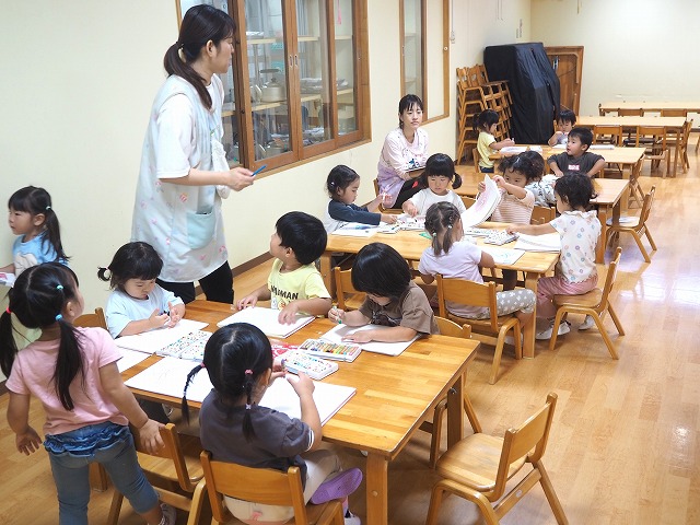卒園するまでの何枚の絵を描くのでしょか。この子たちが年中年長になると塗絵に夢中になると思います。そうしたら、塗絵を1日2枚×ひと月20日×12カ月で一年間に約500枚。年中年長の2年間で1000枚!ですね。