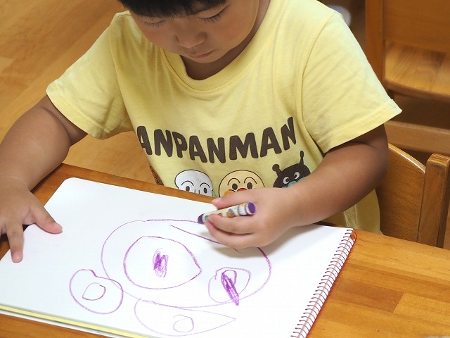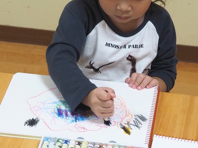 2歳児ゆり組がクレヨンで自由画を描いています。