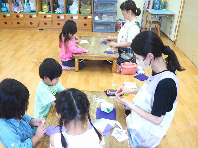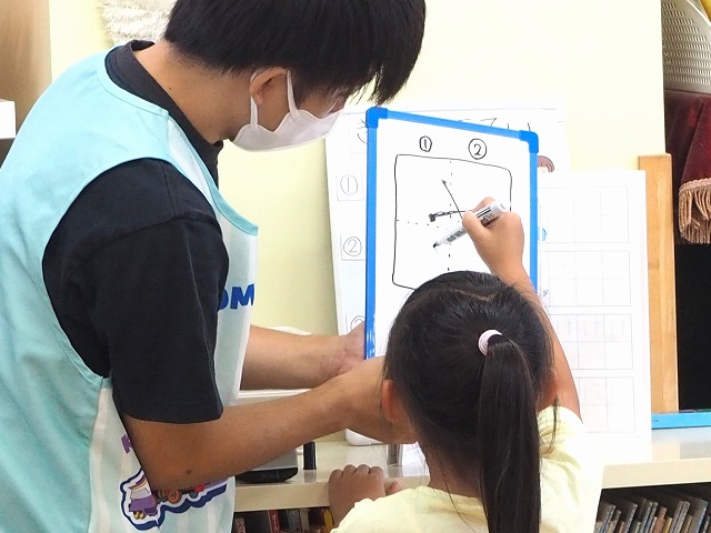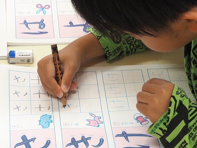 5歳児ひまわり組。ひらがなワークをしていました。四角マスを4分割して、一の部屋、二の部屋、、、と呼んでいました。「さ」の一画目は一の部屋の下のこの辺だね、と先生がこどもたちに意識を促していました。