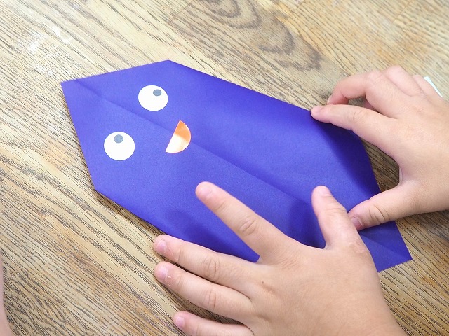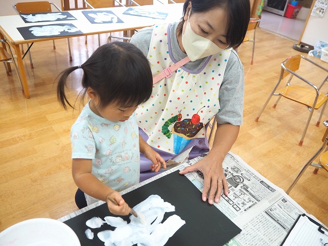 1歳児うめ組。筆で絵の具を塗っていました。オバケの作品になるそうです。