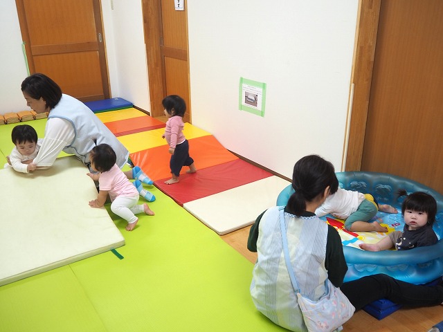 0歳児もも組。2階ホールにマットを用意して遊んでいました。
