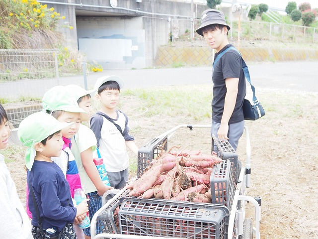 リヤカーいっぱいのサツマイモ。たくさんのサツマイモでこどもたちは誇らしげ。収穫したサツマイモは、さくら組からひまわり組のこどもたちが2本ずつ持ち帰りました。給食でもおやつで大学芋にして食べる予定です。
