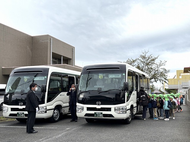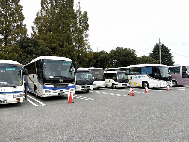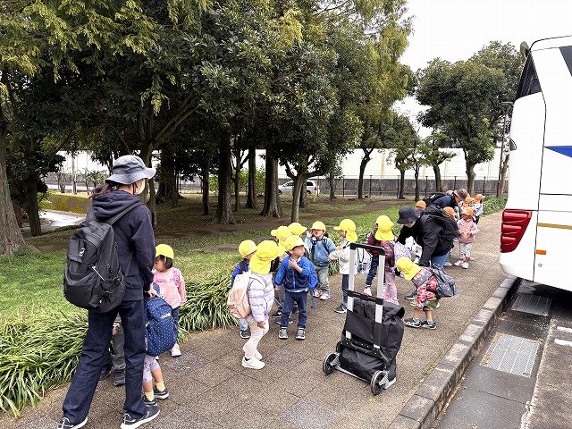 保育園の駐車場に観光バスが到着。9:20、こどもたちが乗り込んでいます。天気はくもりです。今日はこの後晴れるはずだと思っていました。