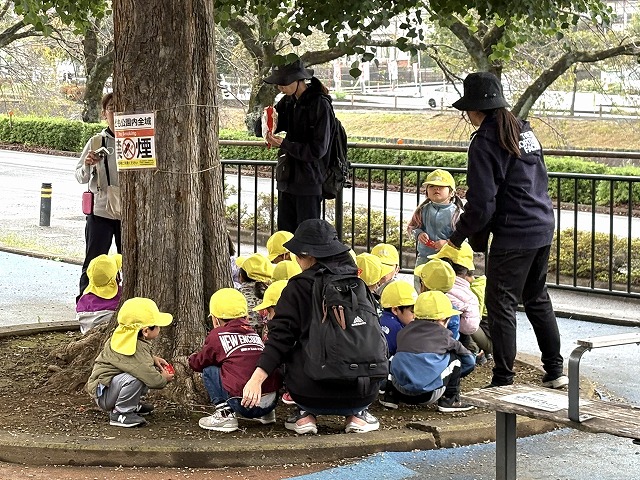 さくら組の撮影のところで雨が強くなってしまいました。木の下に避難しています。