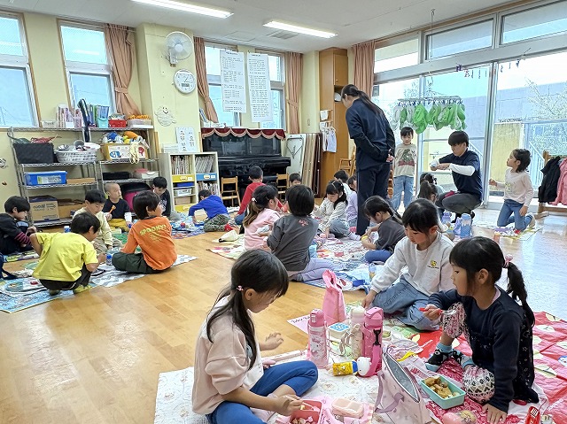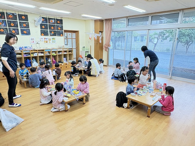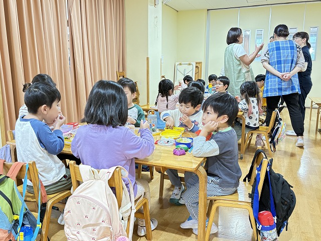 お弁当タイムは、どんな時間よりも嬉しそうでした。雨の遠足でペコちゃん公園では1時間弱しか遊べなかったのですが、お弁当が嬉しくて楽しい遠足になっちゃいました! かわいいお弁当を用意してくださった保護者皆さま、ありがとうございました。