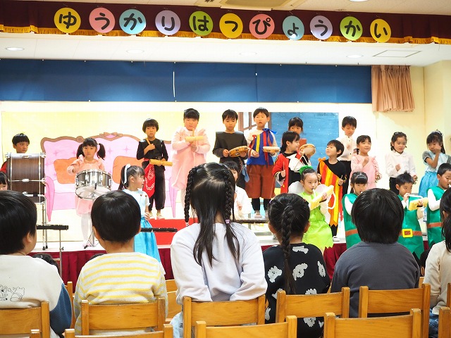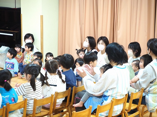 2歳児ゆり組。衣装を着て、控室からステージへの移動など、本番と同じように行いました。ステージに出ないクラスのこどもたちがお客さん役です。