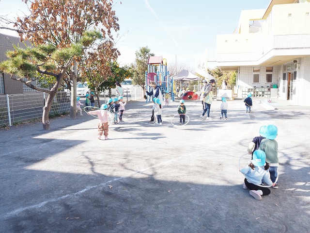 朝は寒いのですが、10時を過ぎてこの時間は日差しが心地よく暖かです。園庭では2歳児ゆり組と3歳児さくら組が遊んでいます。ゆり組のこどもたちがフラフープで電車ごっこをしていました。