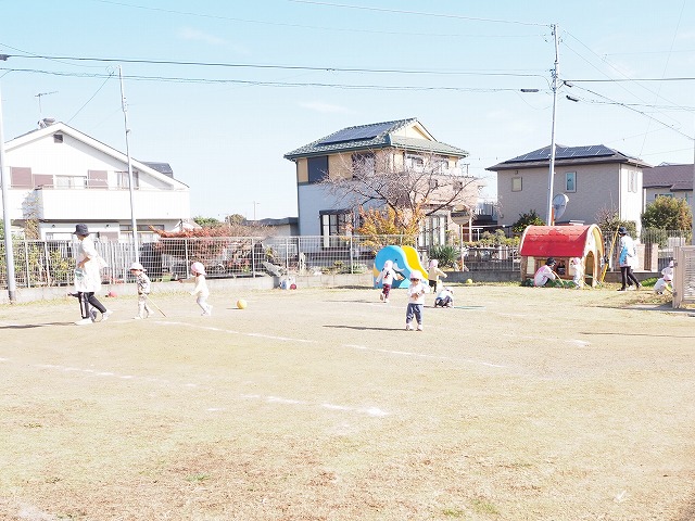 園舎隣り広場では1歳児うめ組が遊んでいました。のびのびと遊んでいました。