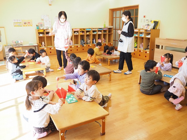 4歳児すみれ組。折り紙でサンタさんを作っていました。折り方を説明する先生をこどもたちはよく聞けていてGood! この後、サンタを画用紙に貼って自由画を描いていました。