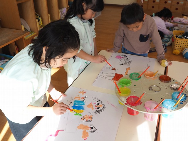5歳児ひまわり組。発表会の自由画を描いていました。