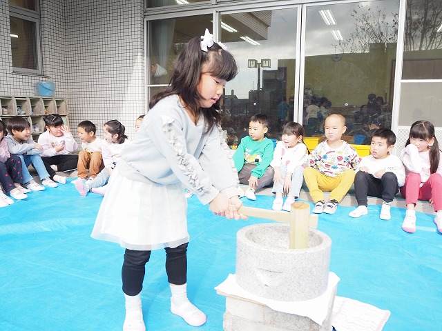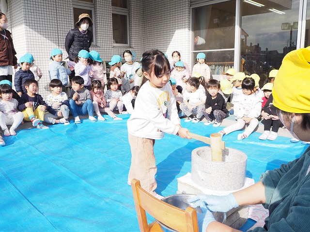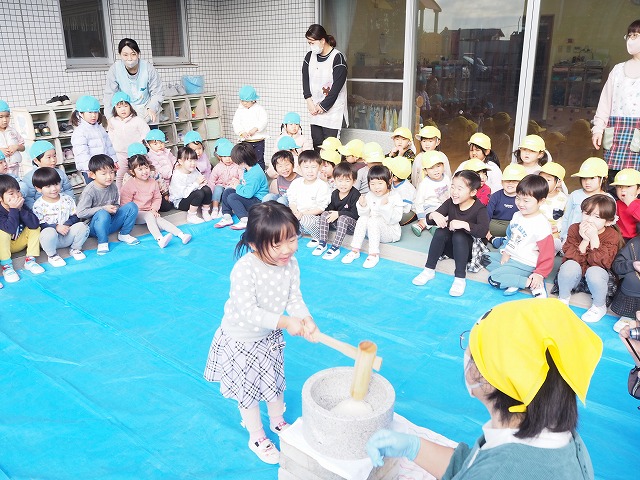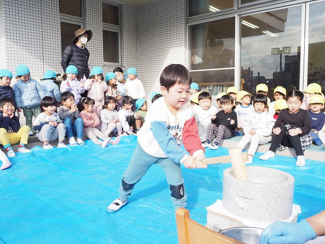 楽しい餅つき体験のひとときでした。ひまわり組は保育園生活で最後のもちつきでした。お餅つきをしたこと、つきたてのお餅の味、よい思い出になればいいなと思います。