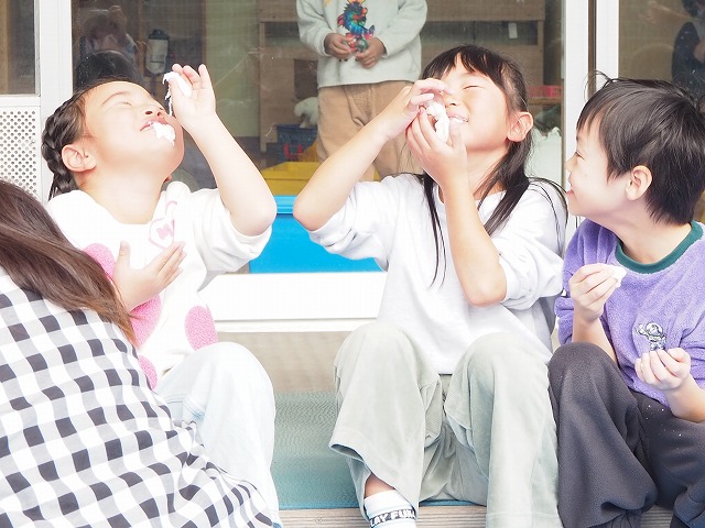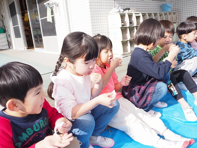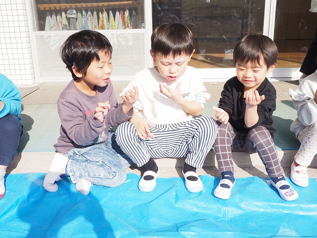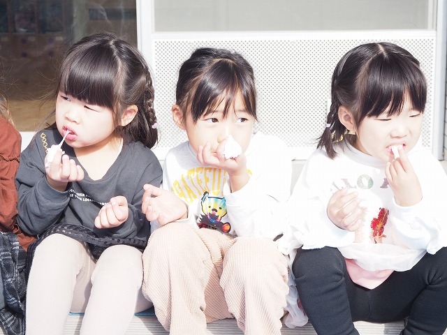 もっと食べたいと言っていた子がいましたが、つきたてのお餅は一口ずつ。おやつのきなこ餅とあんころ餅は厨房の餅つき器で調理したものを食べました。安全を考慮してお餅を食べるのは4歳児クラスと5歳児クラスとしました。