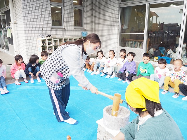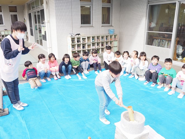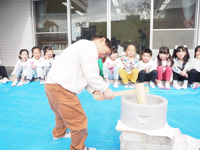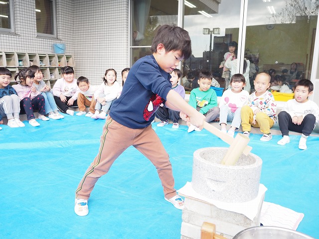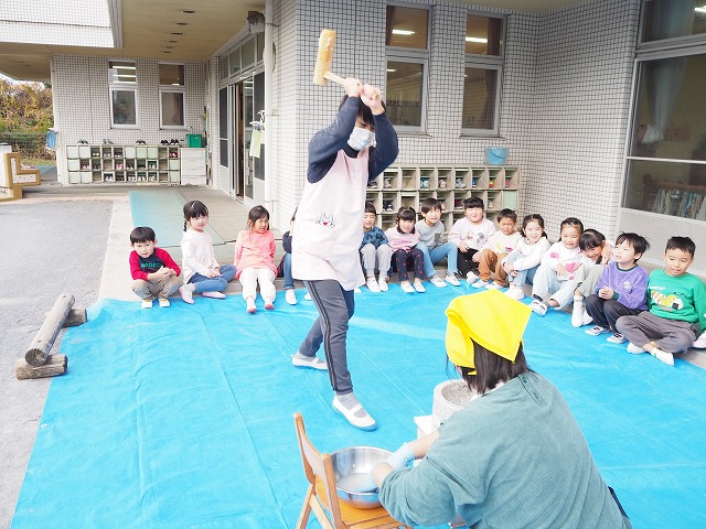 今日は4歳児すみれ組と5歳児ひまわり組が餅つき体験をしました。