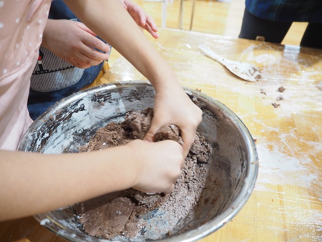 小麦粉をフルイにかけて、卵を割ってバターと混ぜて、などの工程で各テーブルのペースで作業をすすめました。
