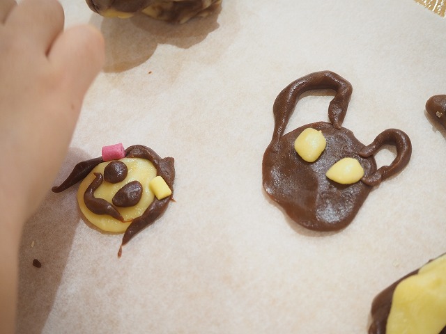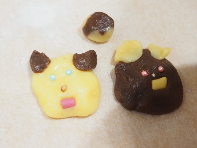 ココア生地30gとプレーン生地30gで計60gの生地で好きな形にしてトッピングしていきました。