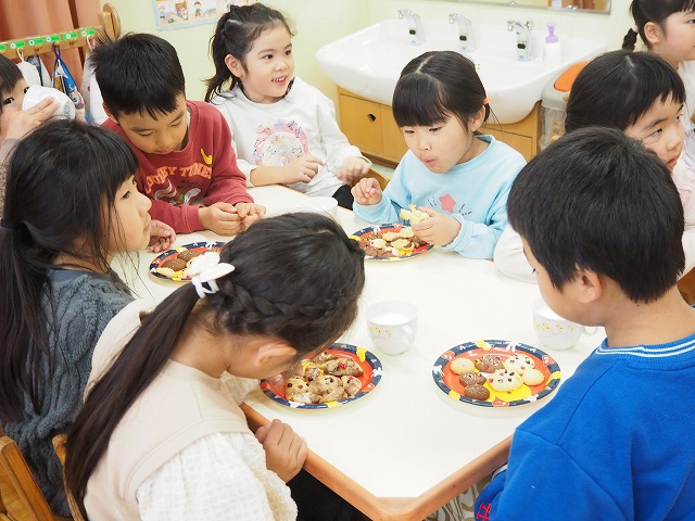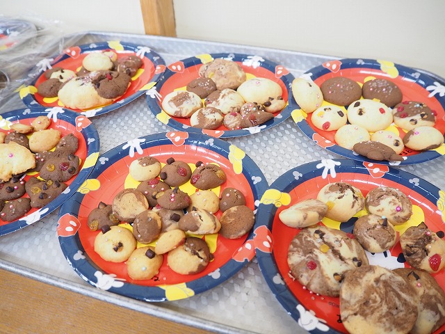 ひまわり組のおやつの時間。お皿にはこどもたちの名前が書いてありました。こどもたちは自分で作ったクッキーを食べました。