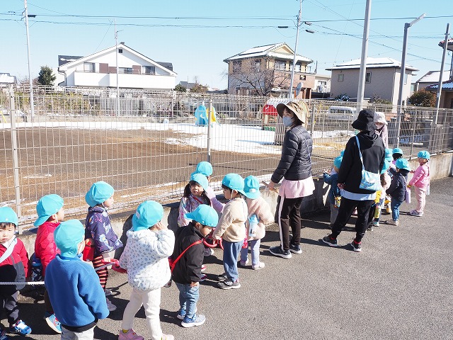2歳児ゆり組が散歩に出発。今日は晴天で、真っ白になった畑と真っ白の富士山が見れたと思います。