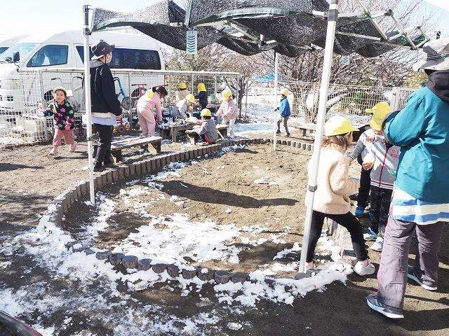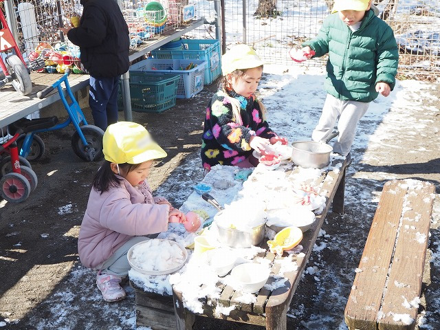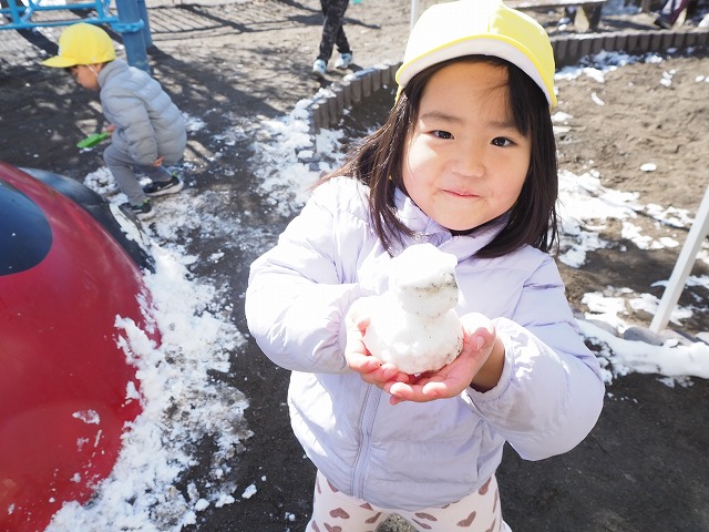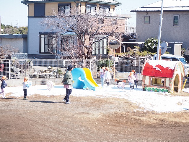 園舎隣り広場の芝の上にも雪が残っていました。冷たい雪に触れて、楽しそうに遊んでいました。
