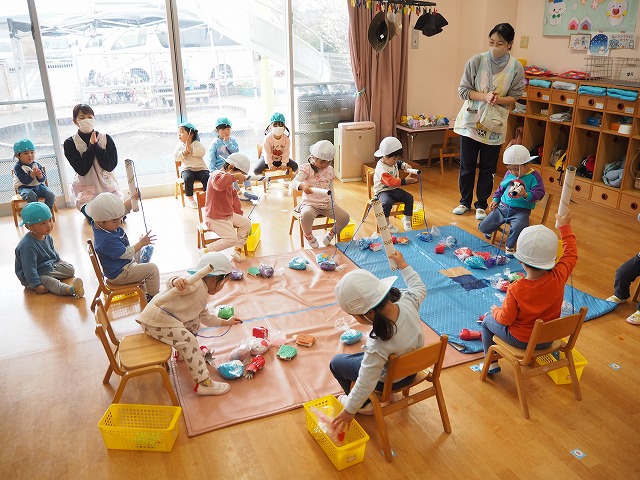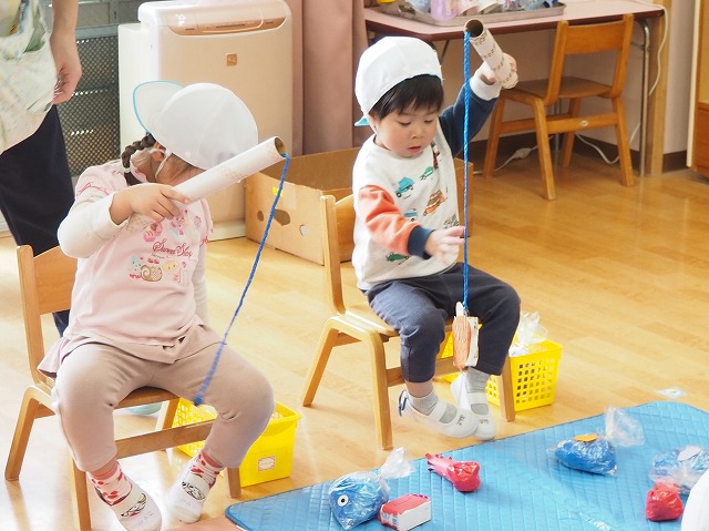 小雨のため朝の園庭遊びが出来なかったので、2歳児ゆり組は釣り堀遊びをしていました。