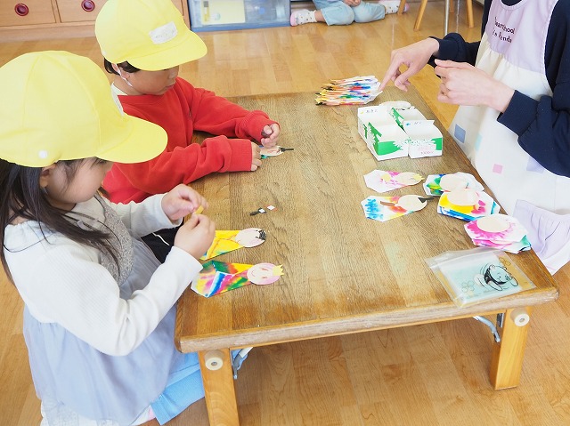 3歳児さくら組は、園庭遊びしながら順番に制作をしていました。