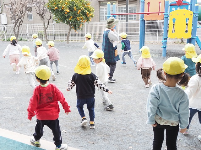 園庭へ飛び出すさくら組。先生の「いーよ」の声に、なぜかみんなでダッシュしていました。