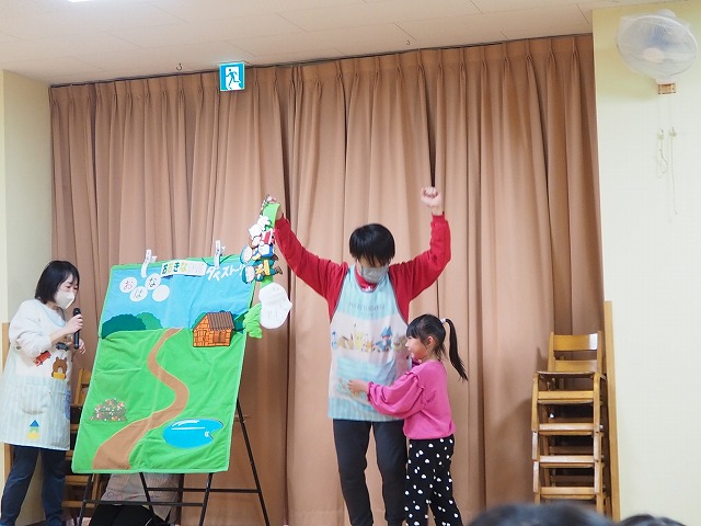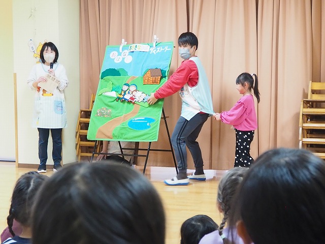 お誕生者の紹介のあとは、「おおきなかぶ」のお話。おじいさん、おばあさん、まご、いぬ、ねこ、ねずみ、そして先生と年長のお誕生者が引っ張りました。