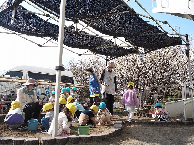 砂場もにぎやか。奥の梅の花が4分咲きくらいになりました。春に向かって三寒四温の毎日ですね。