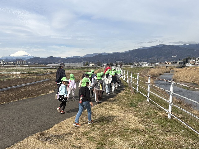暖かくお散歩日和。白い富士山を見ながら、鈴川沿いを歩いて岡崎小学校へ。