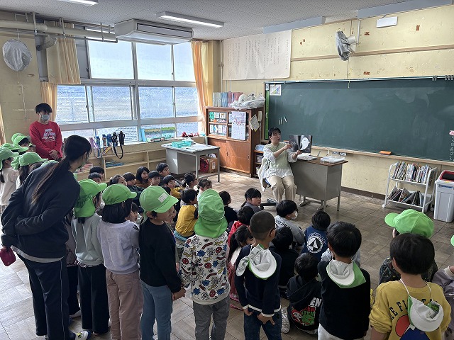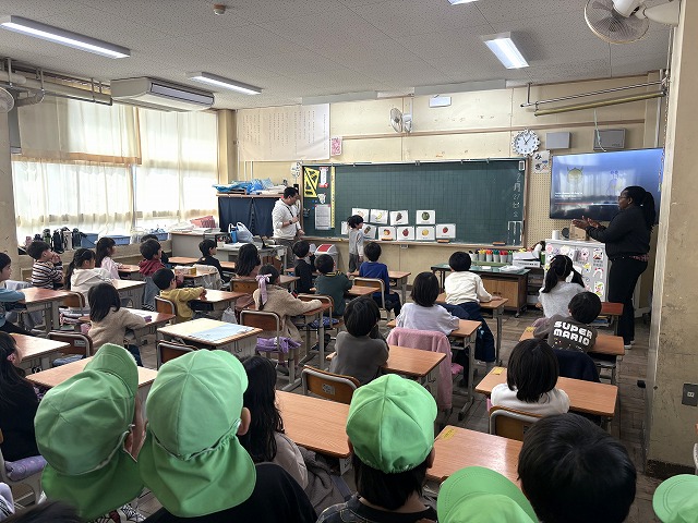 1年生の授業見学。英語でした。外国人先生のネイティブな果物の英単語を聞き取る内容でした。ゆうかり保育園の英語学習があるのでこどもたちは授業の様子に親しみを感じたのではないでしょうか。