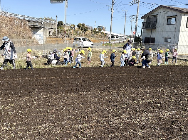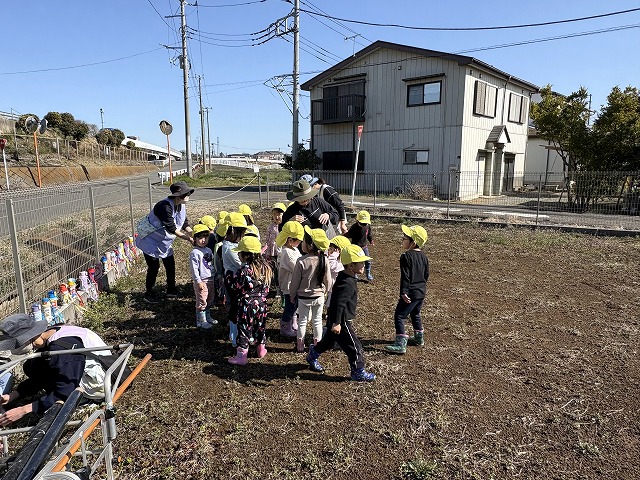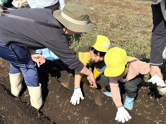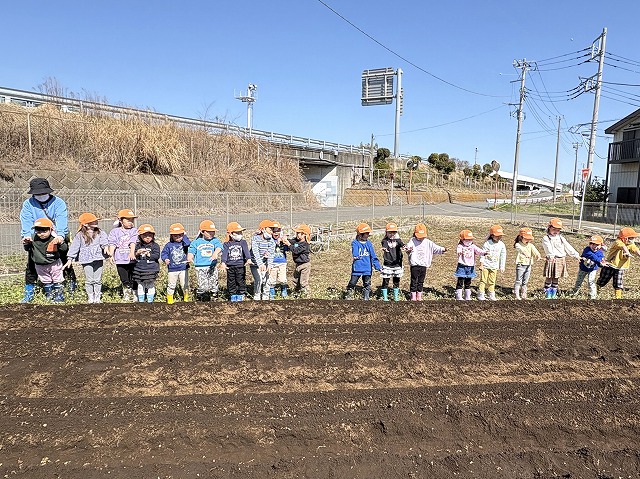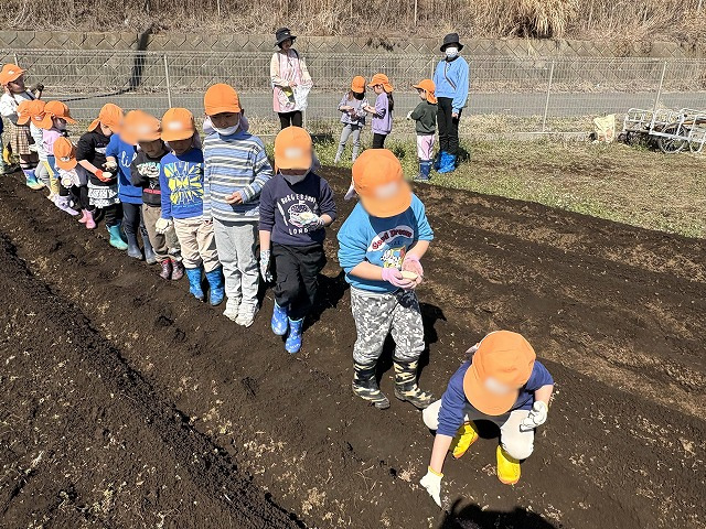 今日は3歳児さくら組と4歳児すみれ組がジャガイモの植え付けをしました。とってもいい天気でした。