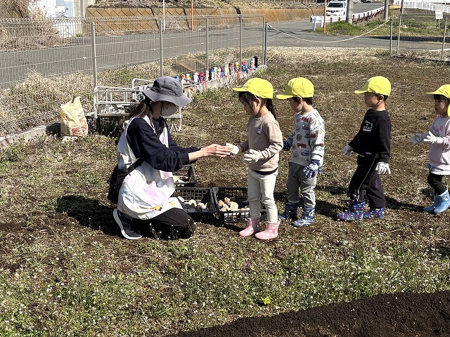 先生から順番に種芋をもらっているところです。