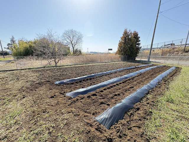 植え付けのあと、マルチと呼んでいる黒いビニールシートをかけて本日の作業は終了です。こどもたちの優しい手で植え付けたジャガイモ、豊作になりますように。